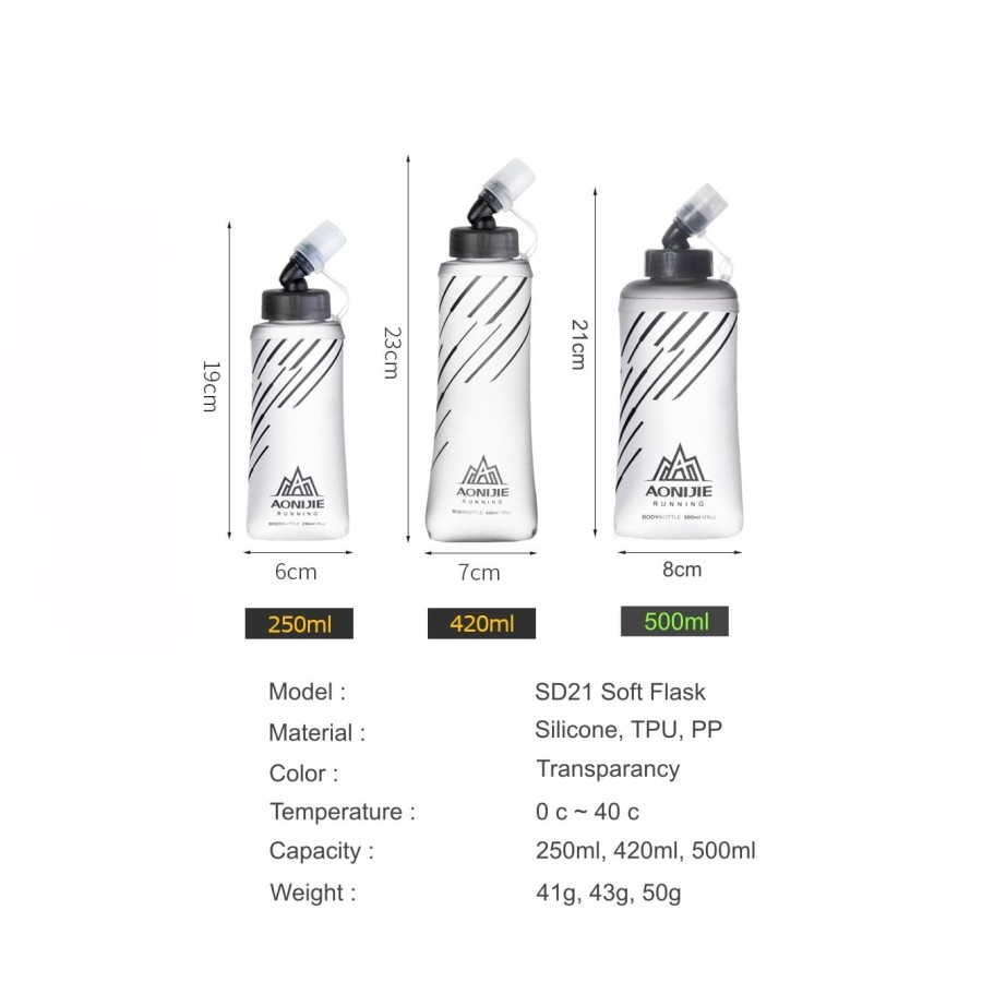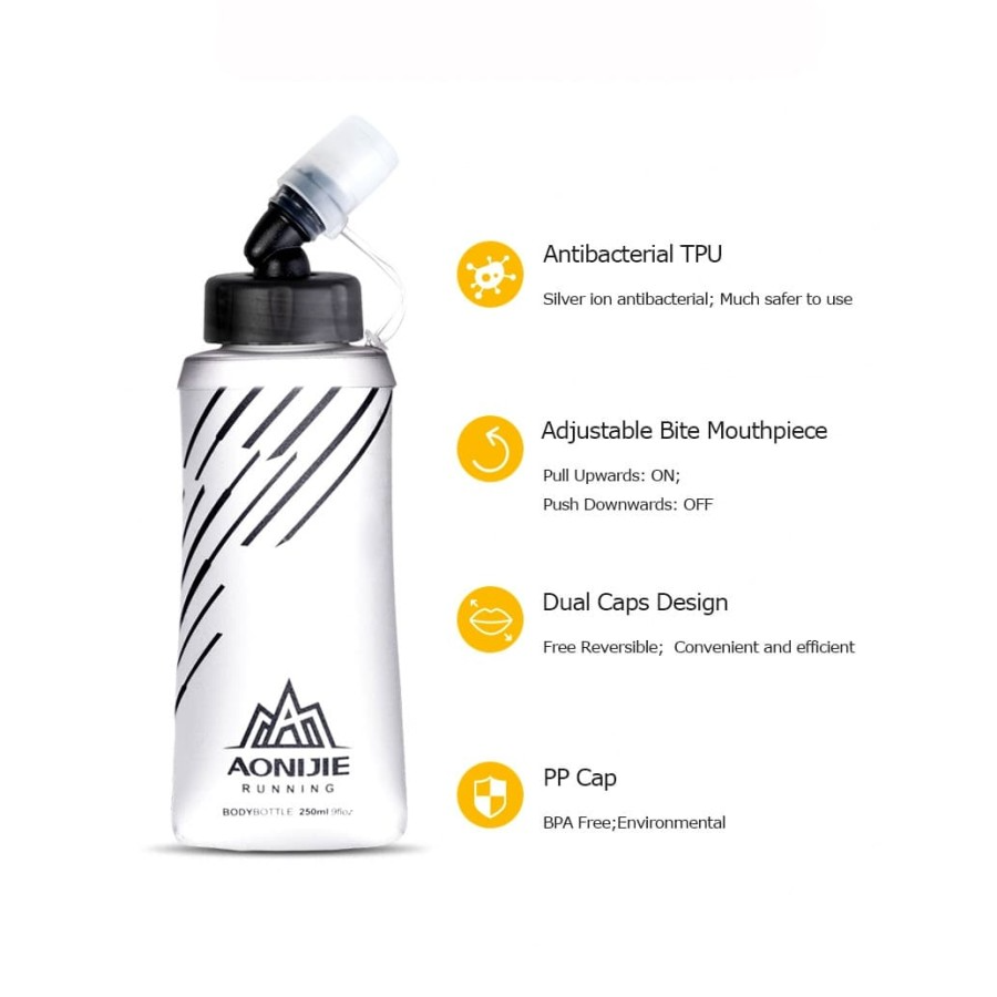 Botol lembut, bahan berkualitas dari Aonijie, berkapasitas isi 250ml, sangat cocok menemani aktivitas olahraga anda.